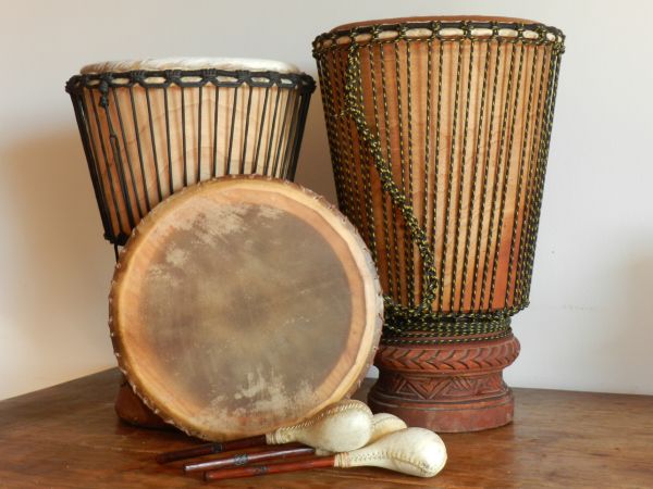 Handgeschnitzte Djemben, mit naturgegerbeter Ziegenhaut bespannt, von 30cm bis 65cm Höhe.